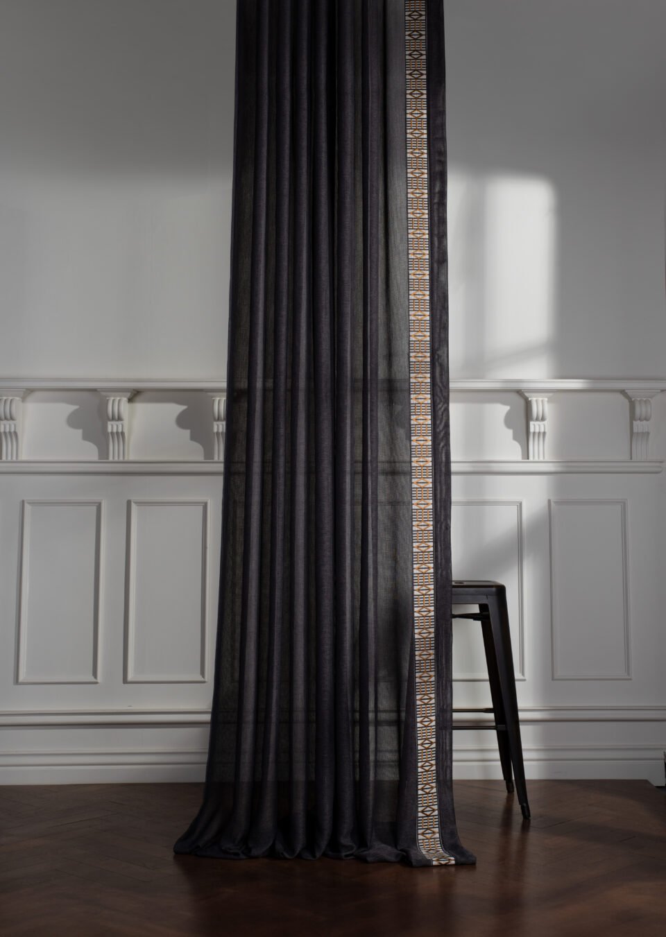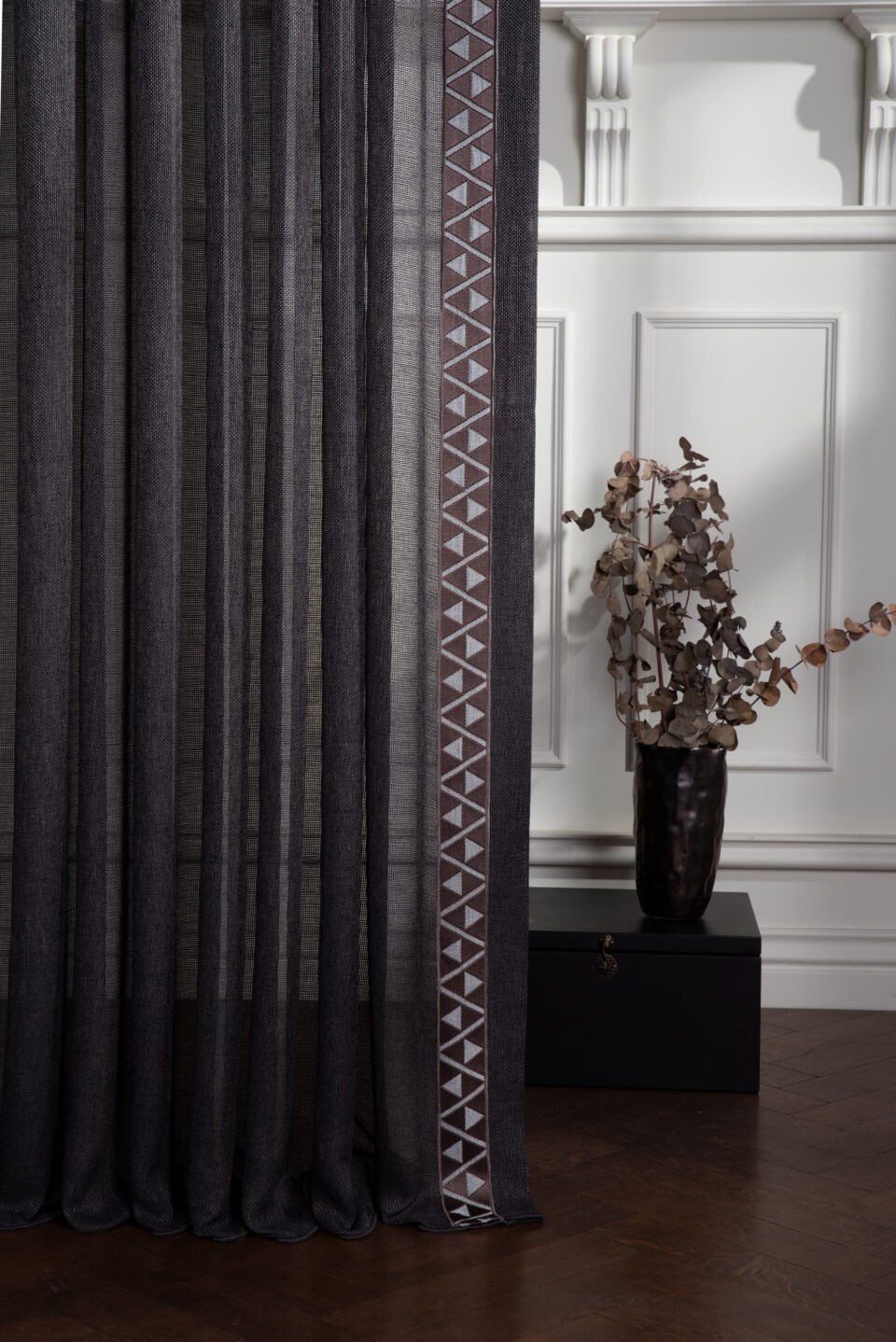 Bej ve siyahın kontrast uyumunu zarif bir bordür detayıyla buluşturan ABUS, modern ve klasik dekorasyonlarda şık bir odak noktası oluşturur.